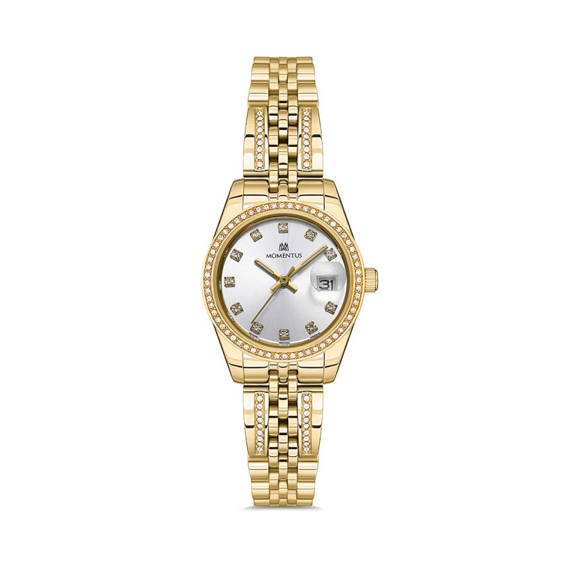 Momentus Kadın Kol Saati SS257G-02SG 26 mm Kasa Çapı, 3 ATM Su Geçirmezlik, 316L Paslanmaz Çelik Kordon, Mineral Cam. Makine Modeli: Japon Epson VX82 Çalışma Şekli: Quartz Kordon Kilidi: Kilitli Klips Kordon Genişliği: 13 mm 12/24 Göstergesi: Yok Takvim: Tarih Cam Şekli: Düz